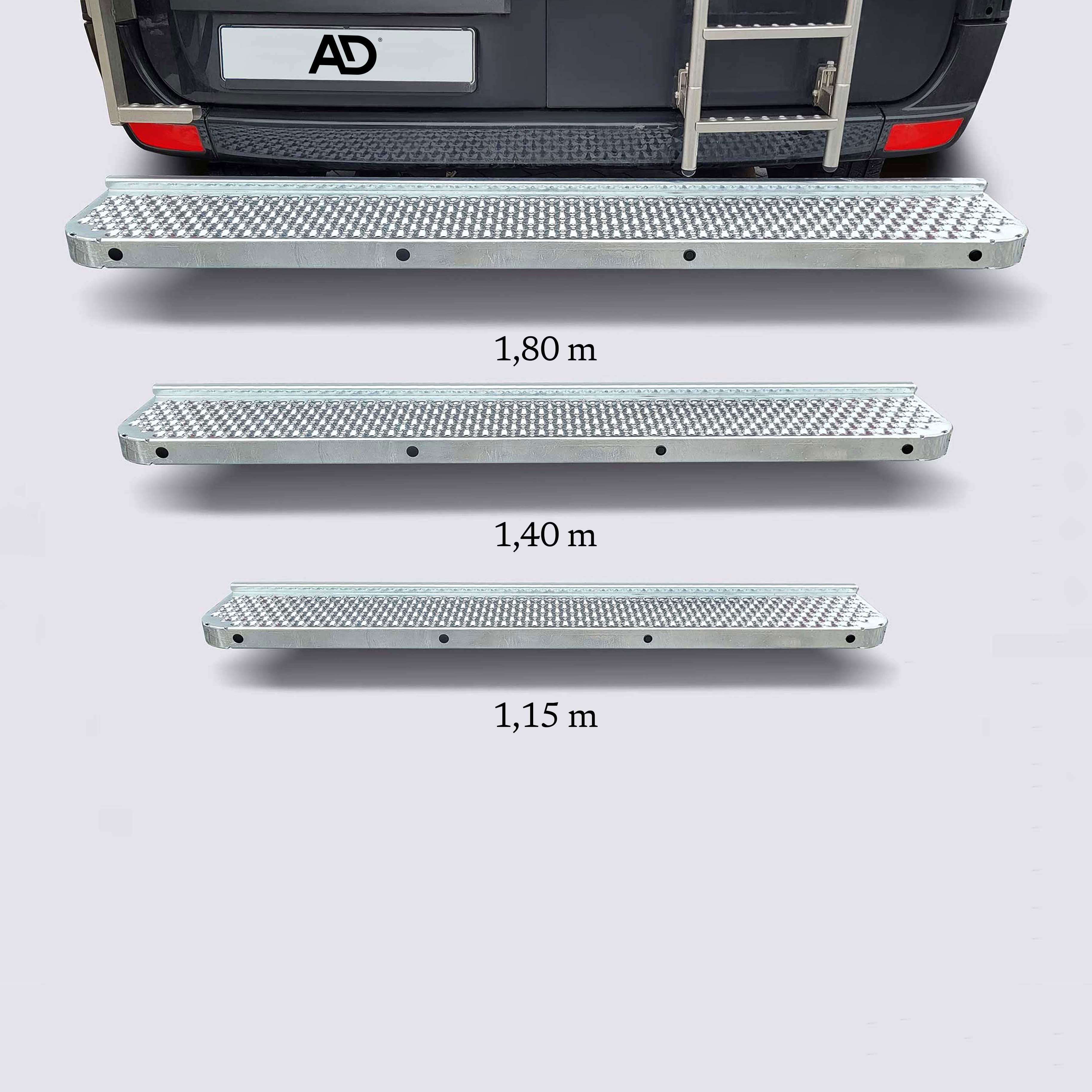 Die HTF Trittstufe erhalten Sie in 3 Breiten (1,15 m, 1,40 m und 1,80 m). Zudem ist diese Stufe passend für über 15 verschiedene Transporter-Versionen!